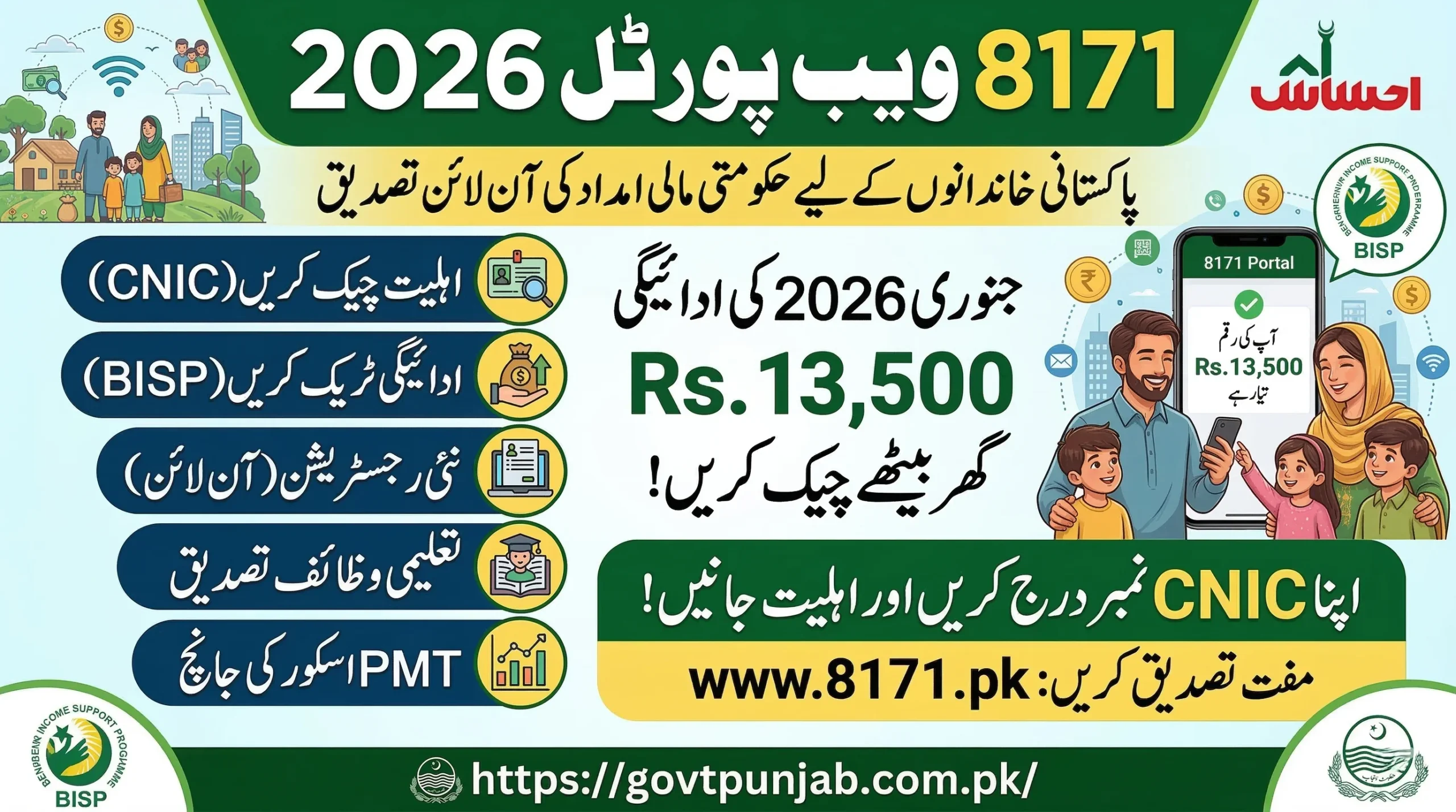 Through this portal, beneficiaries can complete Online registration BISP, perform 8171 PMT score check, verify BISP January 2026 payment, and confirm education stipends through 8171 Taleemi Wazaif check online by CNIC 2026.