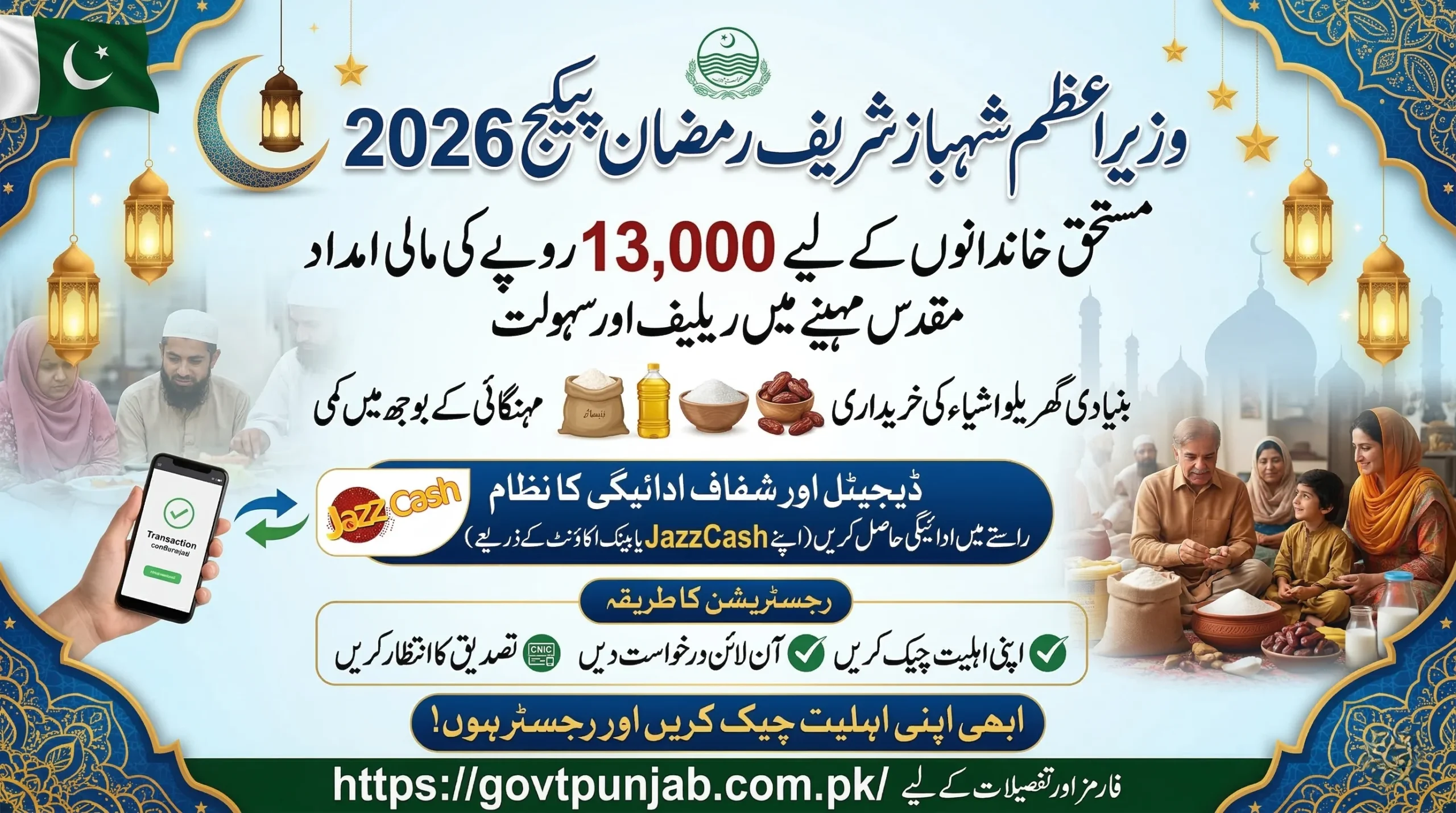 Through this initiative, the government is providing Rs. 13,000 financial assistance to deserving households. The funds can be used to buy essential items such as flour, rice, cooking oil, sugar, dates, milk, and other daily necessities that are commonly used during Ramzan.